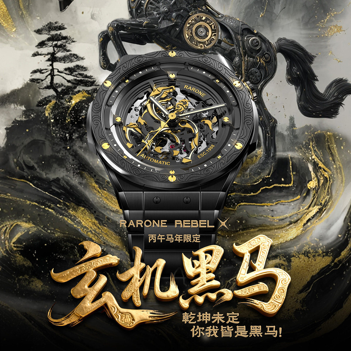 马年新品Rarone雷诺双子星玄机黑马手表男机械腕表新年春节不打烊