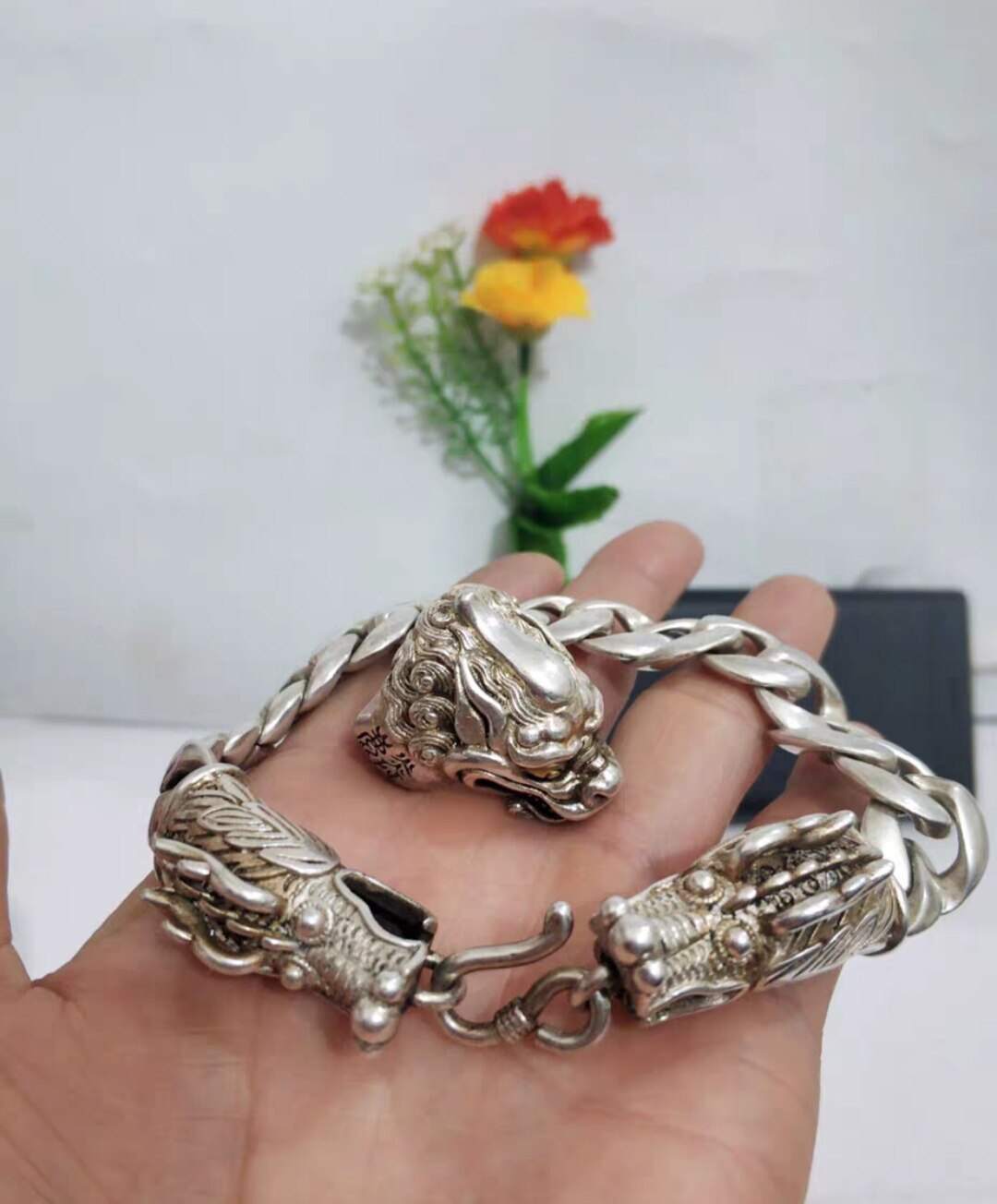 做旧白铜镀银手工铸造双龙头手链手镯戒指一套925银手链男人手链
