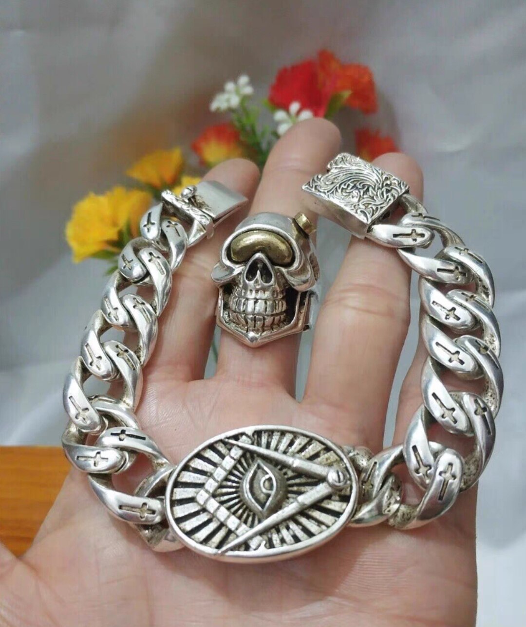 做旧白铜镀银手工铸造手链男人手镯戒指一套时尚首饰925银手链