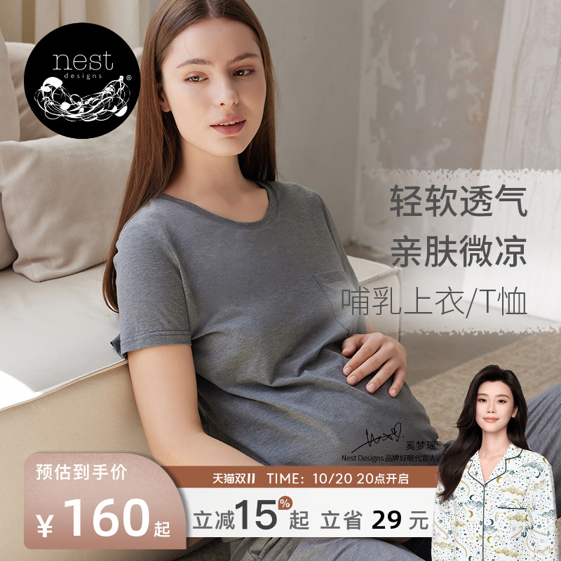 Nest Designs哺乳上衣竹纤维T恤秋季女士孕妇装月子服产后哺乳衣