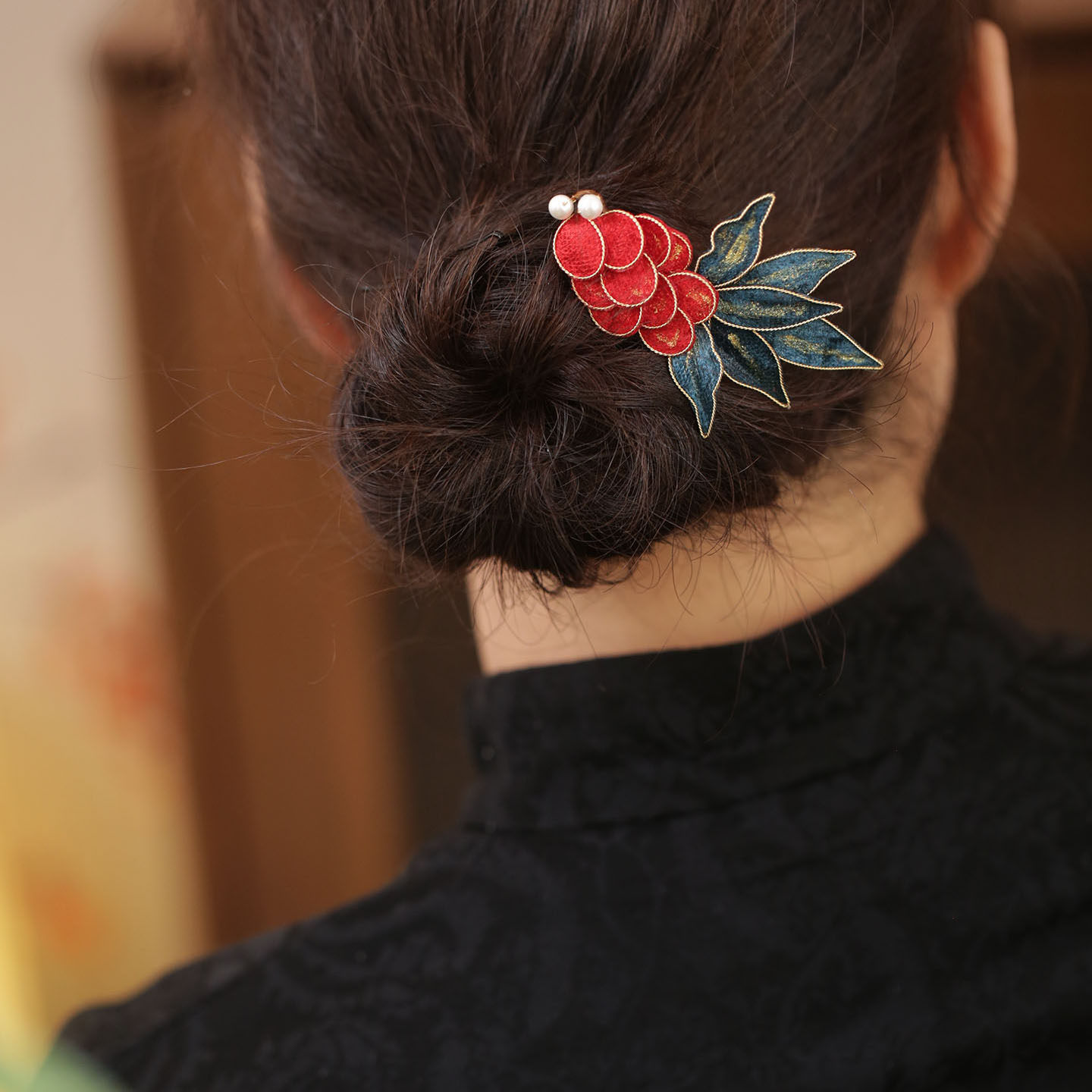 复古红色山茶花低丸子头古风旗袍发饰清汉女蝴蝶发夹侧边新娘头饰