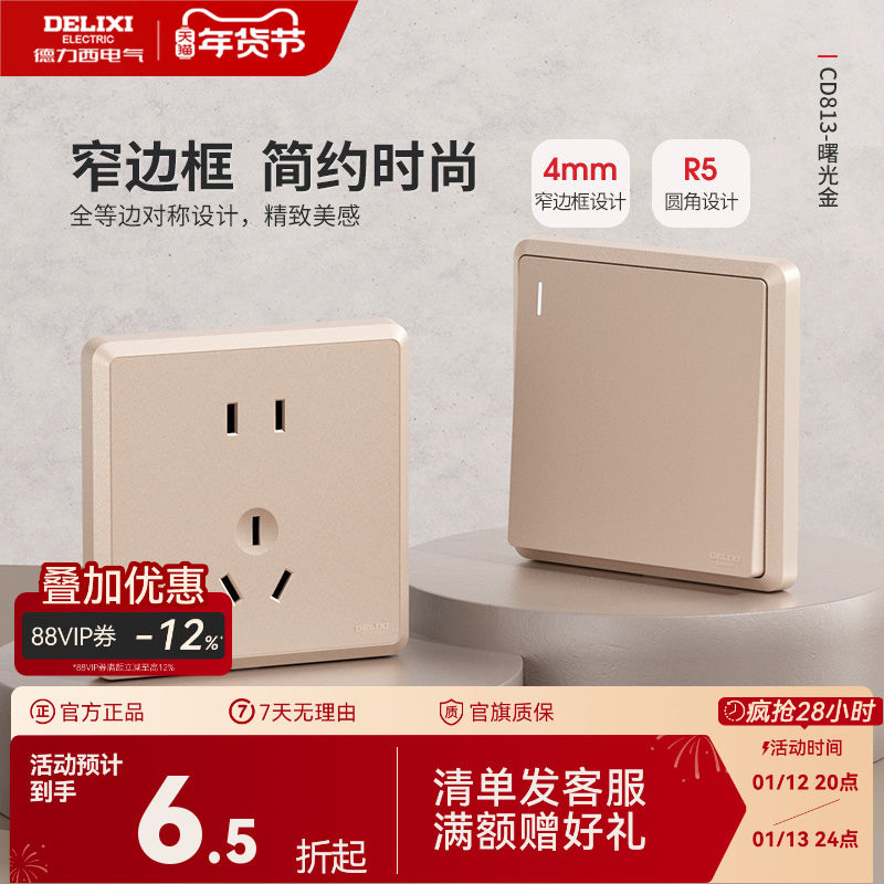 德力西开关插座面板官方旗舰店墙壁家用黄色86型暗装一开五孔插座