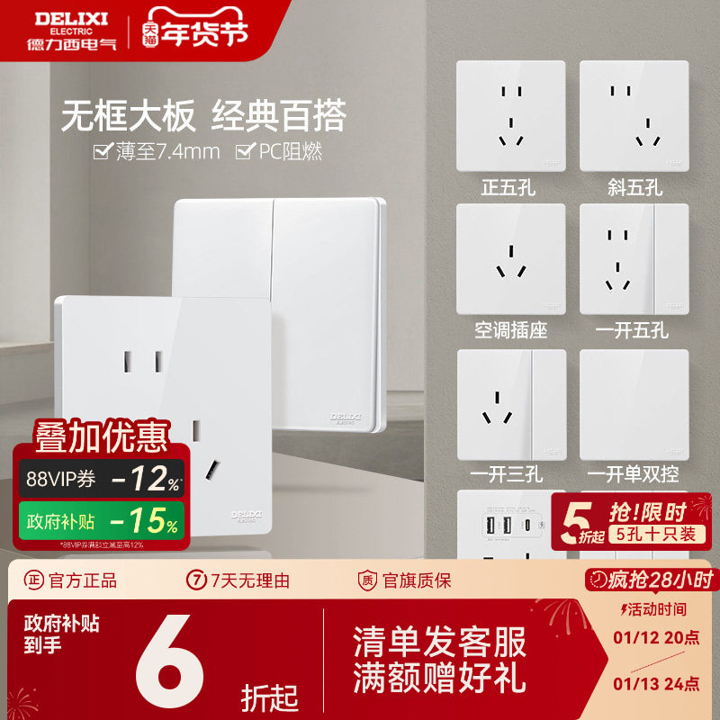 德力西开关插座面板斜五孔家用5孔带usb七孔86型墙壁暗装一开五孔