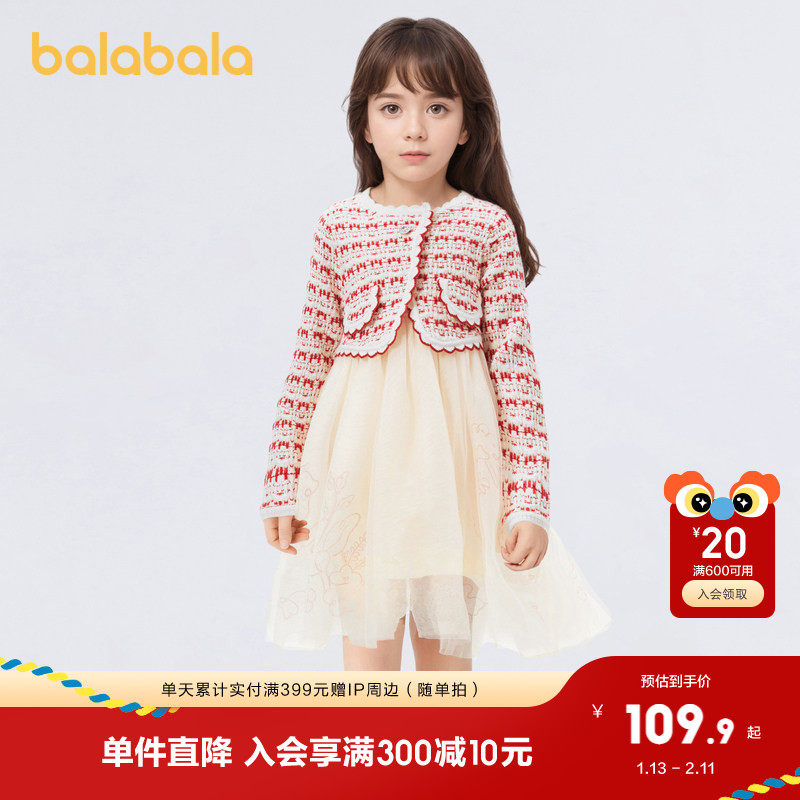 巴拉巴拉儿童裙子秋冬连衣裙女童公主裙纱裙假两件设计甜美精致萌