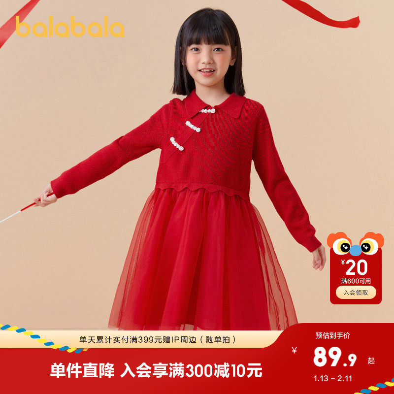 巴拉巴拉女童红色连衣裙儿童裙子春秋装国风毛衣网纱裙针织公主裙