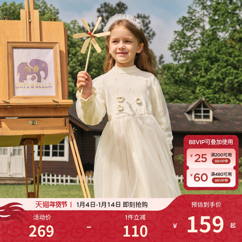 戴维贝拉女童连衣裙儿童针织纱裙女孩公主裙秋季新款白色毛衣裙子