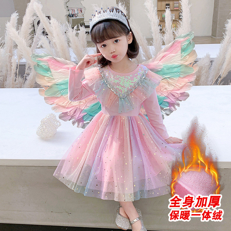 2025新款女童加绒连衣裙儿童彩虹翅膀网纱裙子女孩秋冬生日公主裙