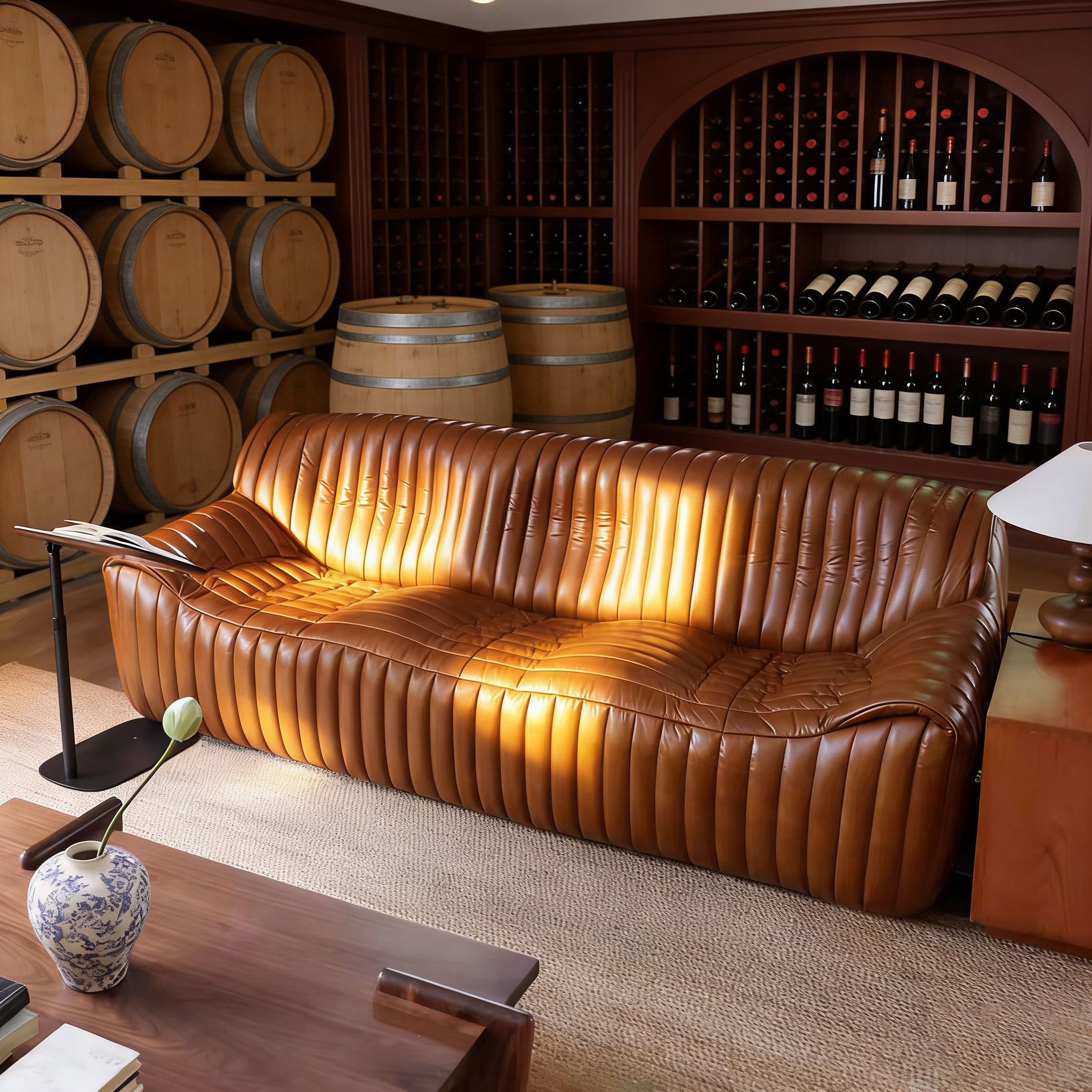 复古高端中古真皮直排沙发美式油蜡皮做旧设计师款雪茄吧波浪沙发