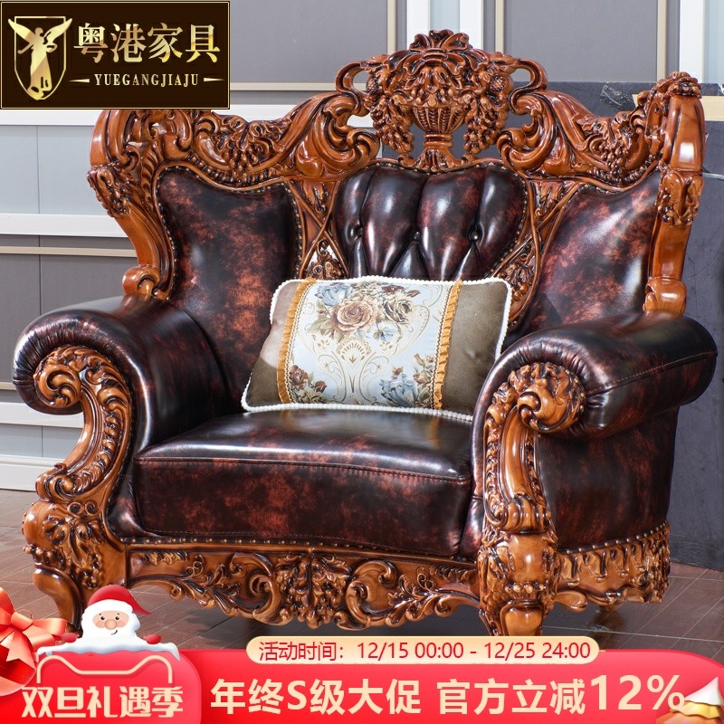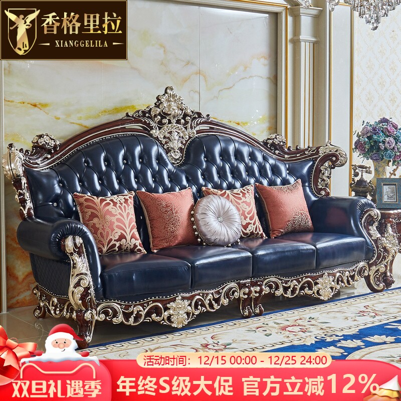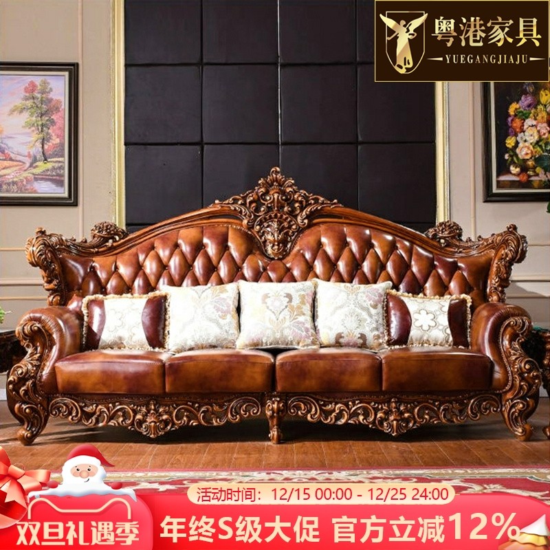 欧式真皮沙发美式奢华别墅复古1234组合沙发实木雕花大气皮艺沙发
