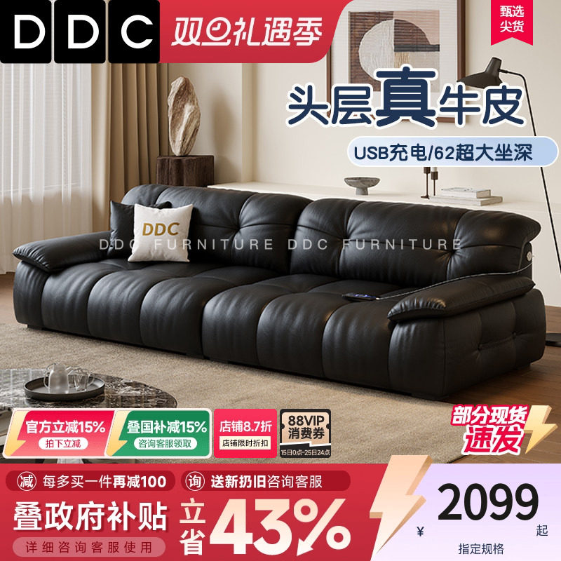 政府补贴DDC意式黑色真皮沙发客厅美式复古真牛皮沙发中古风家具