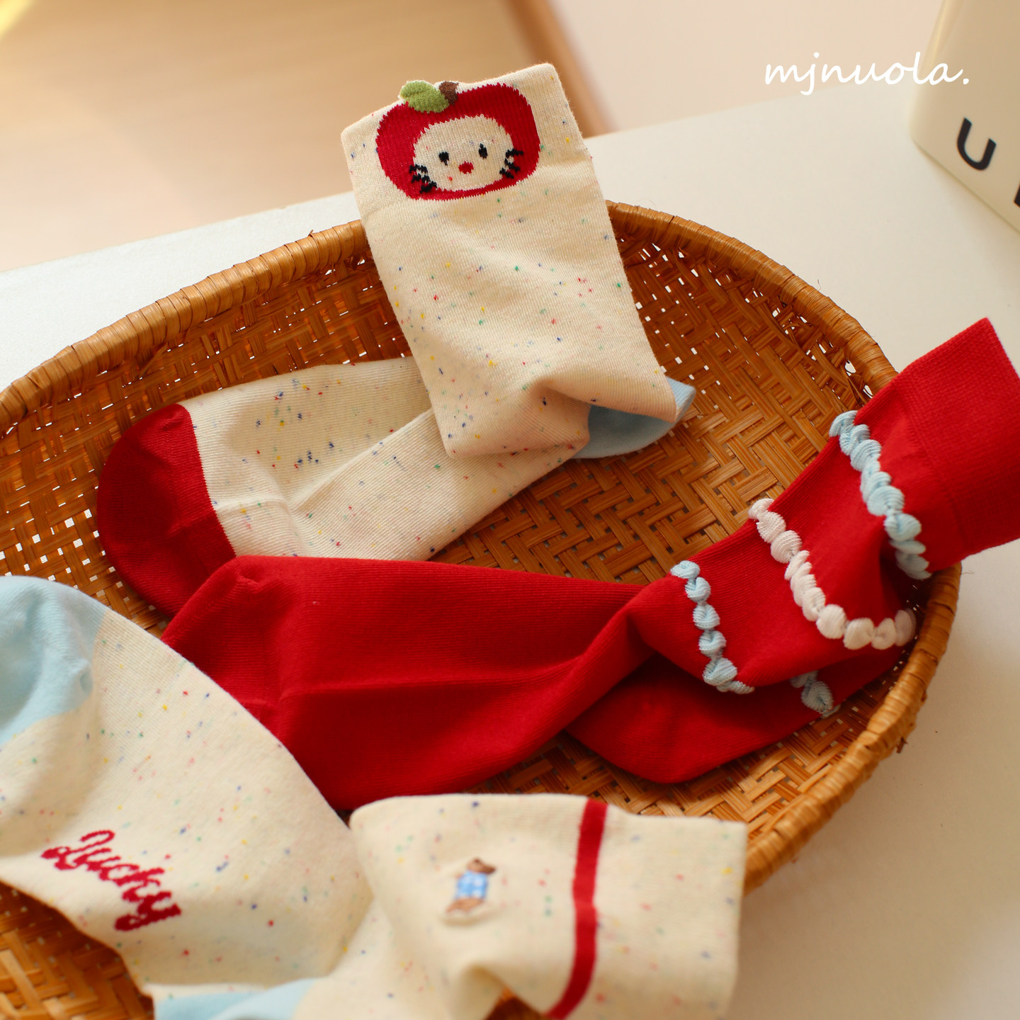 米吉诺拉 无骨春秋季韩版红色系少女袜卡通刺绣纯棉堆堆中筒袜子