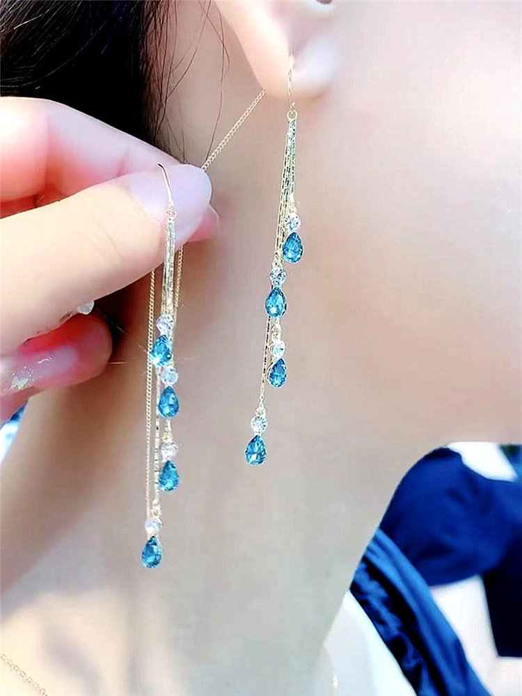韩国气质蓝色水晶长款流苏耳线2025年新款时尚高级感网红轻奢耳环