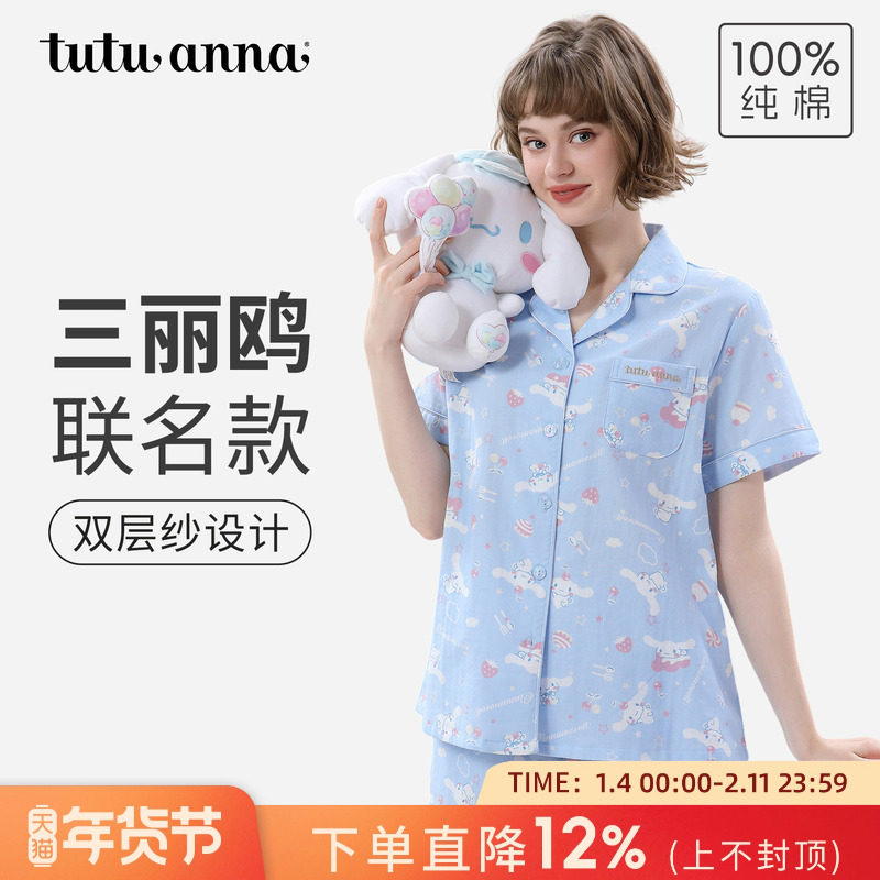 tutuanna全棉睡衣女夏 双层纱大耳狗满印前扣短袖透气家居服套装