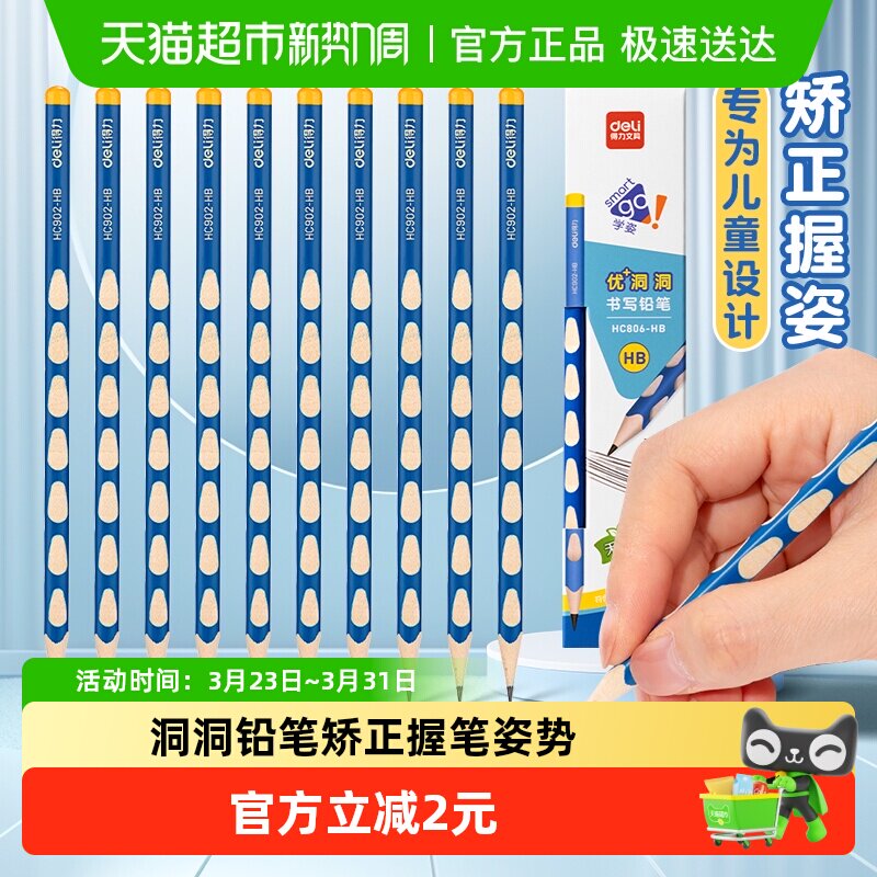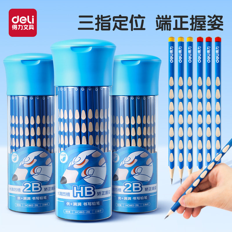 得力洞洞铅笔2b小学生专用HB特粗铅笔幼儿园矫正握姿笔无毒三角杆
