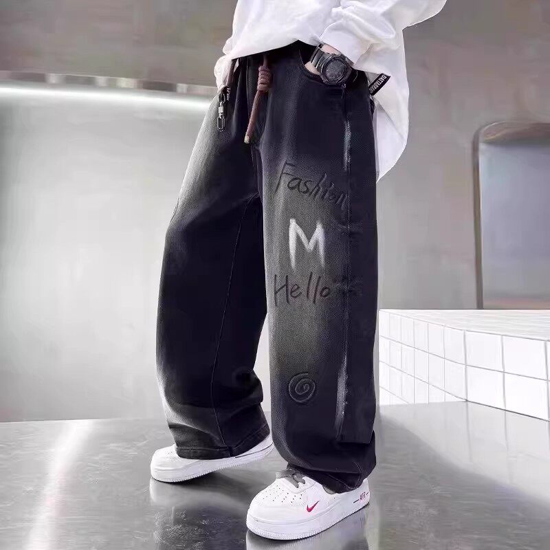 男童秋冬泼墨阔腿黑色加绒弯刀牛仔裤2026新款儿童直筒宽松厚裤子