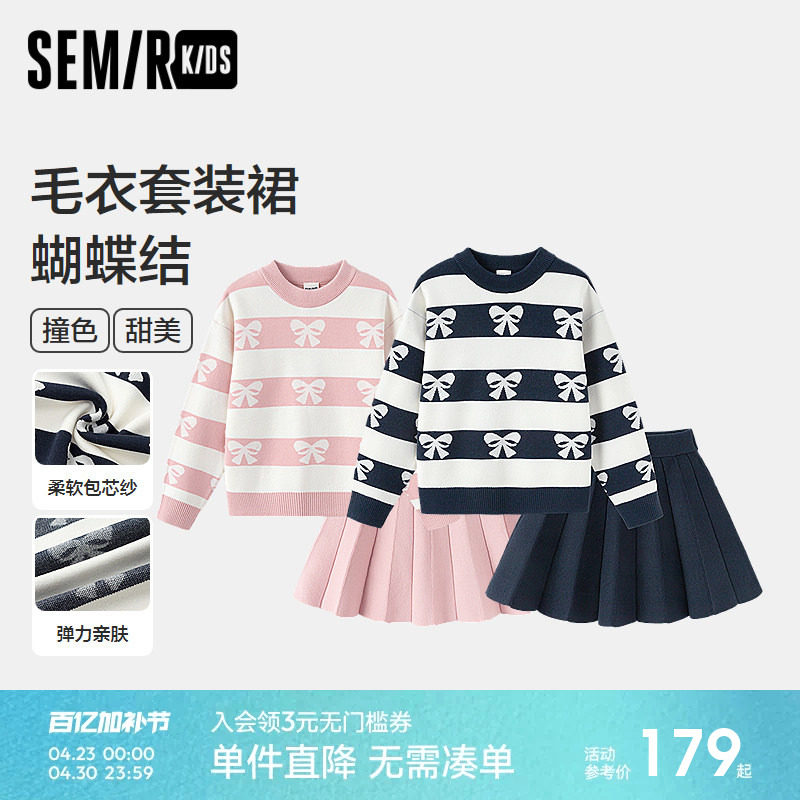 森马儿童毛衣套装2024新款短裙两件套蝴蝶结提花冬装甜美女童装潮