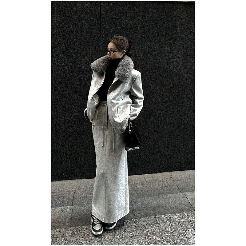2024新款干练御姐灰色大毛领外套上衣系带半身裙两件套装冬装女潮