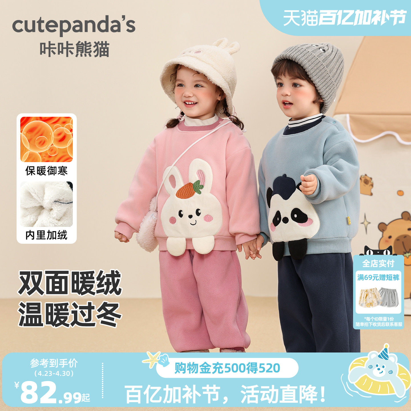 咔咔熊猫宝宝卡通套装秋冬儿童加厚保暖两件套冬装男童女童衣服潮