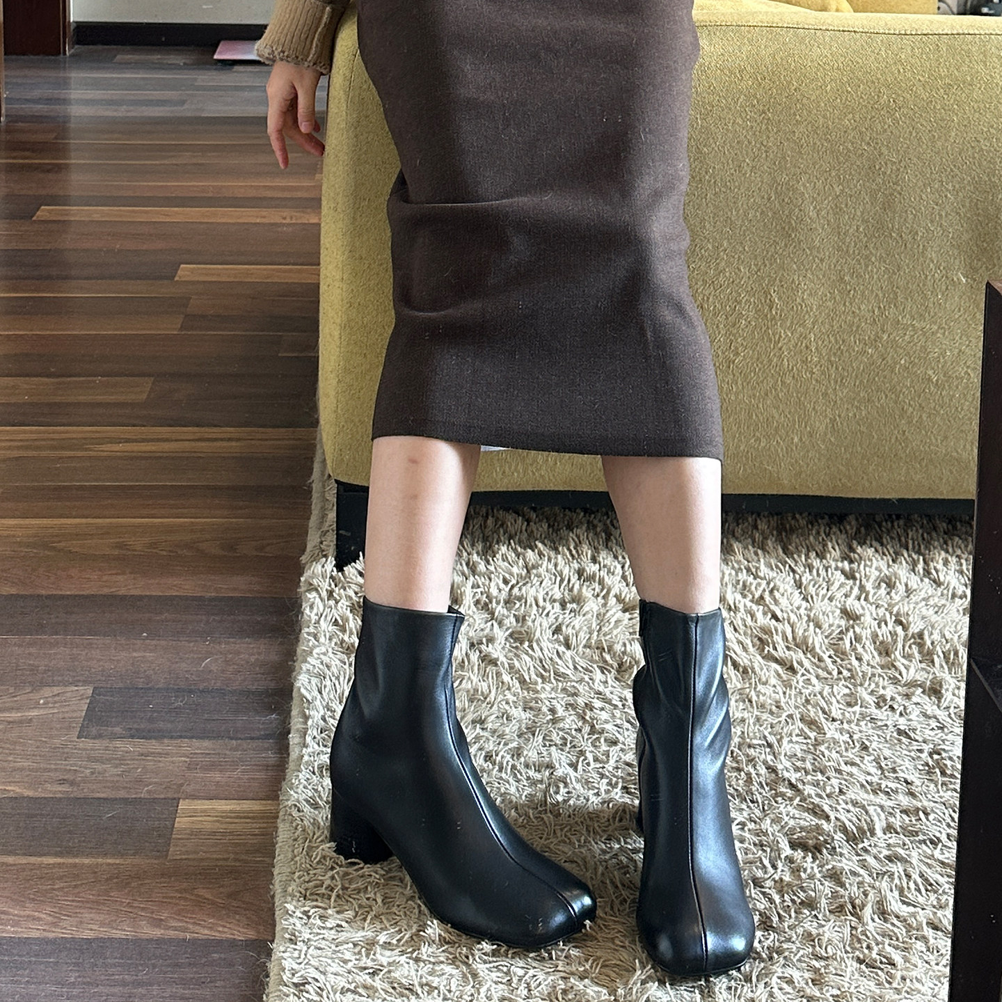 极简风苹果头羊皮软面真皮方头瘦瘦靴高跟鞋粗跟短靴女秋冬小裸靴