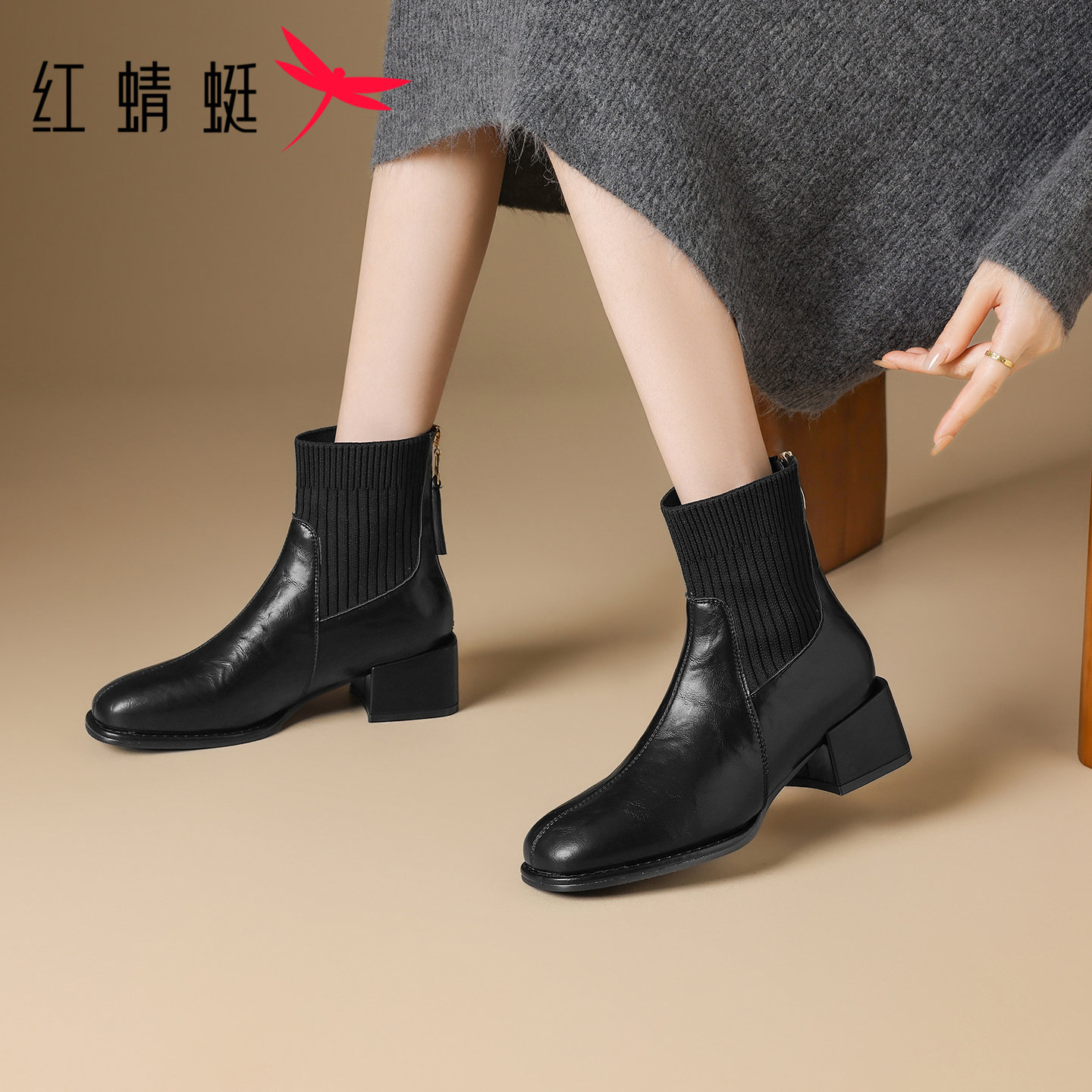 红蜻蜓方头瘦瘦短靴2025新款女士高跟鞋粗跟弹力时装袜靴切尔西靴