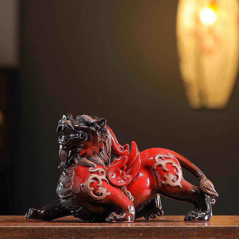 红色陶瓷麒麟摆件一对貔貅描金边桌面装饰工艺品招财瑞兽镇宅中式