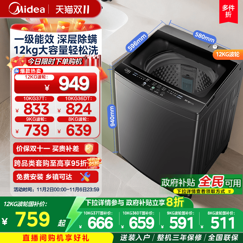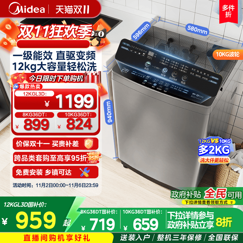[全民补贴]美的直驱变频12/10/8kg全自动家用大容量波轮洗衣机36
