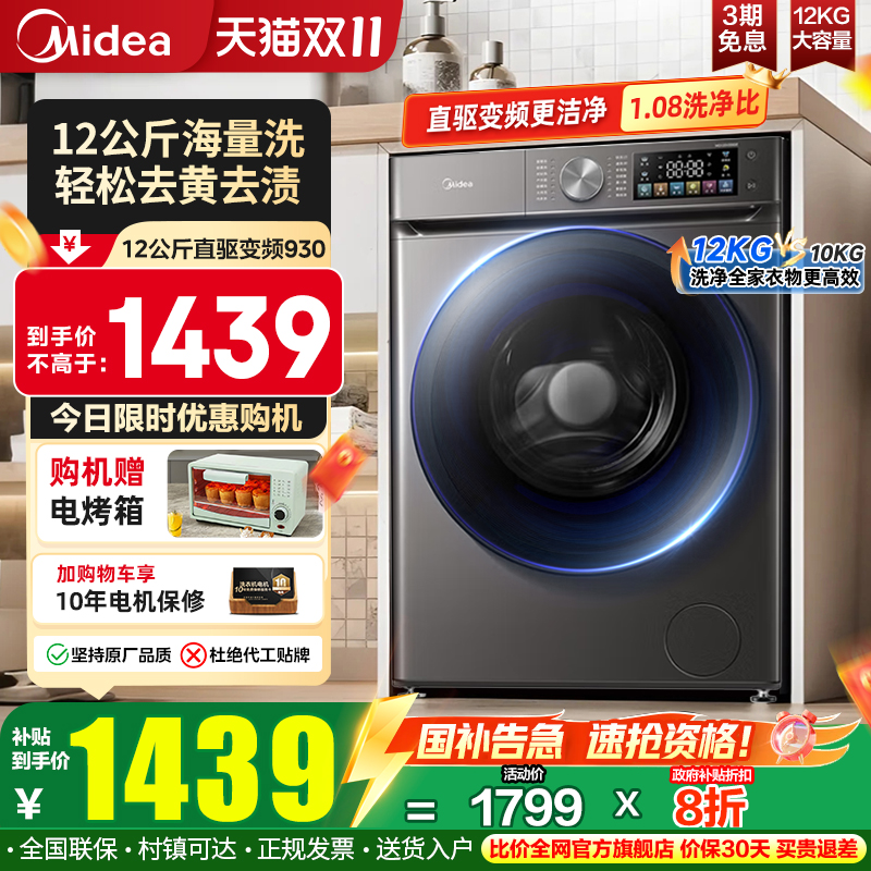 以旧换新补贴美的洗衣机12公斤大容量全自动滚筒除螨菌洗脱一体36