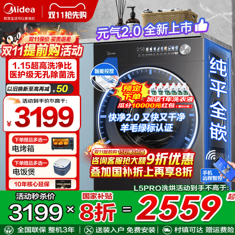 【新品】美的洗衣机滚筒全自动洗脱烘干一体10kg纯平全嵌L5PRO