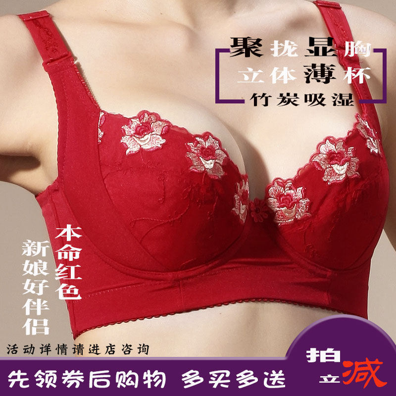 今百伦美容院内衣女薄款大胸显小胸罩红色聚拢侧收副乳调整型文胸