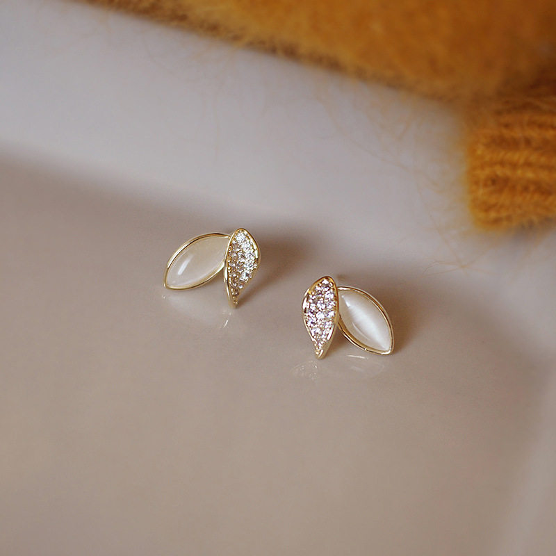 日韩风925纯银树叶耳钉女银质镶钻小众设计感高级百搭猫眼石耳环