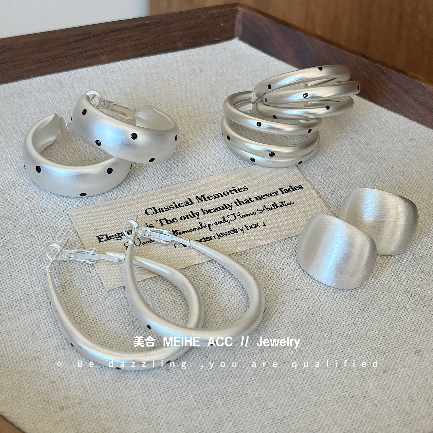 布丁啵啵~高级拉丝银质感几何耳圈耳钉少女感黑波点清新显瘦耳环