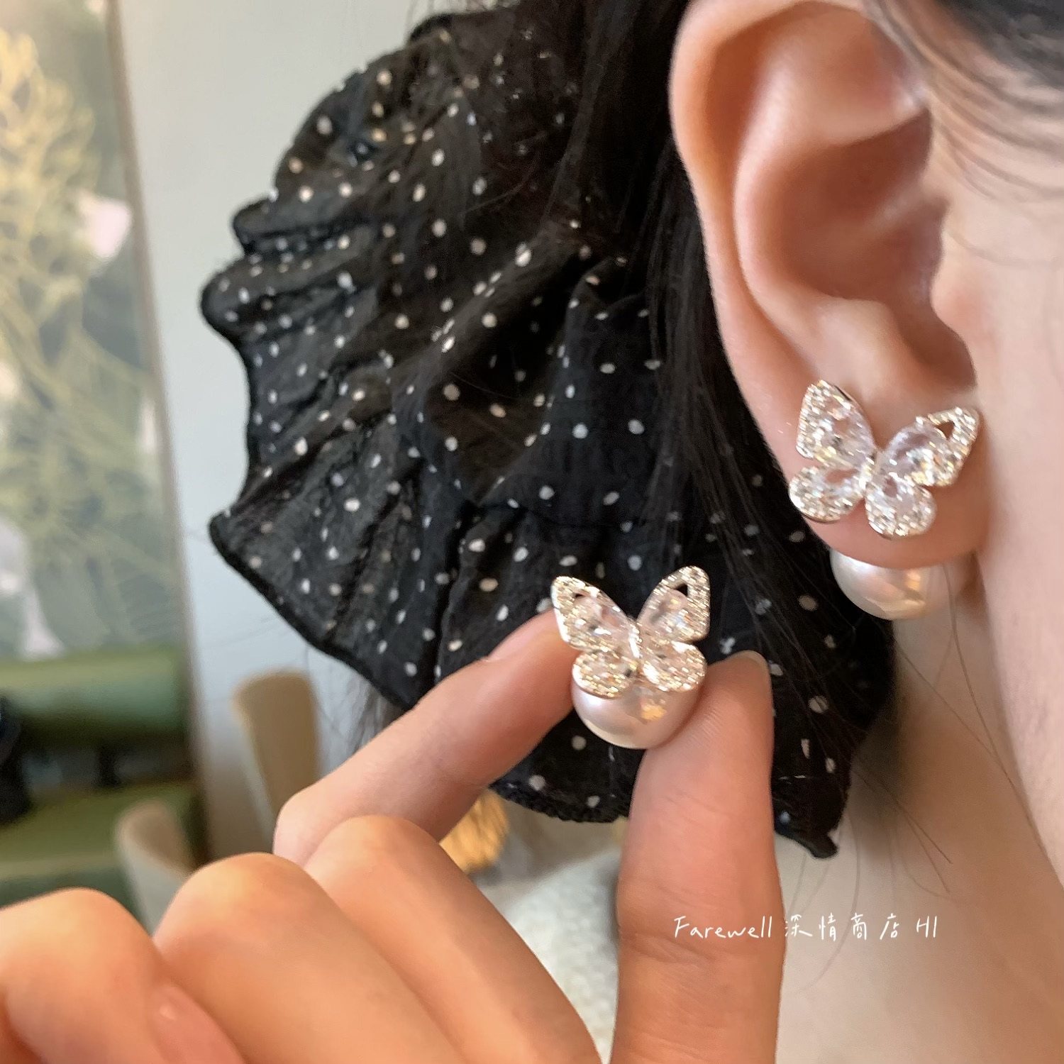 两戴设计珍珠耳环 甜酷轻奢风蝴蝶耳钉 银质闪钻好看双戴耳饰女