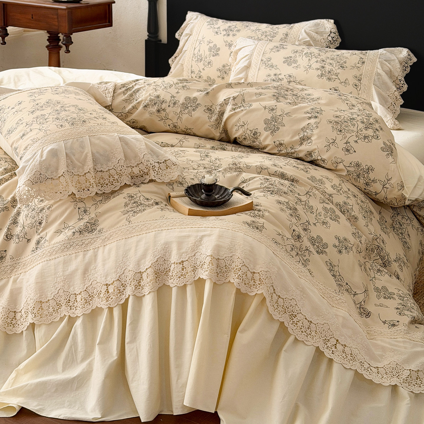 法式复古印花全棉床上四件套纯棉荷叶边公主风田园被套高级感床笠