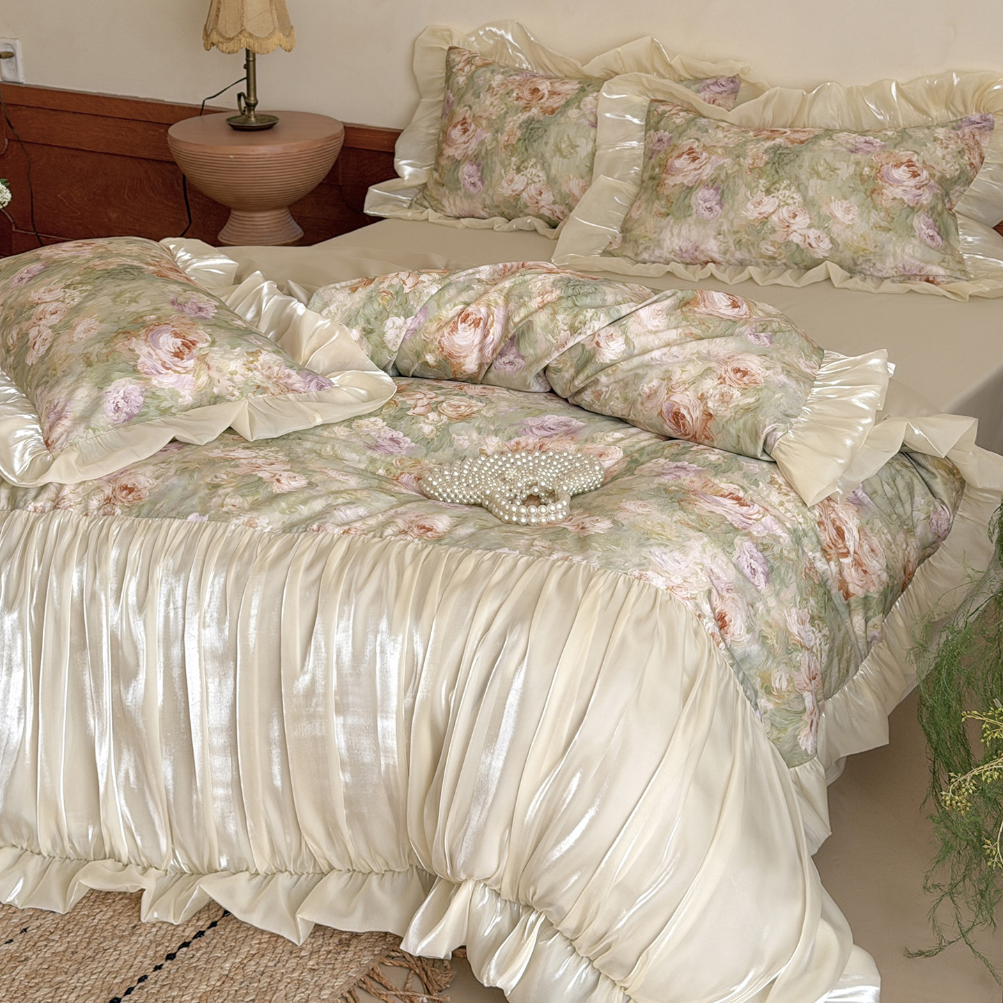 法式油画床裙款全棉贡缎长绒棉四件套纯棉琉璃纱花边被套高级床品