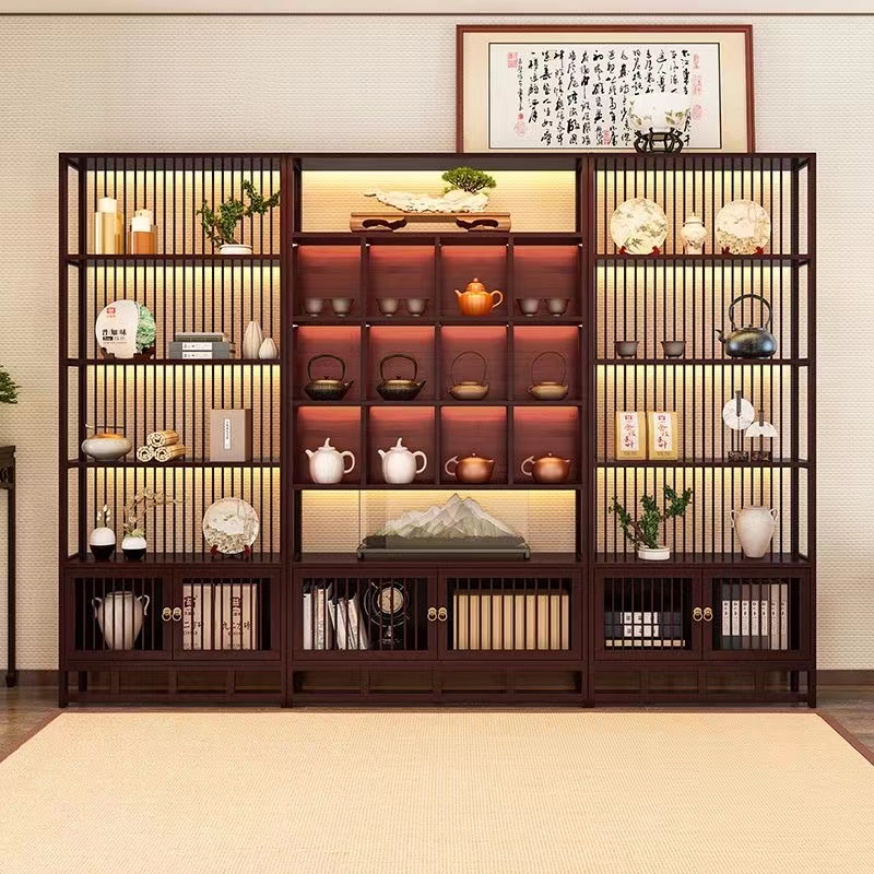 新中式实木博古架茶室背景置物架多宝阁书酒茶叶架商用带灯展示柜