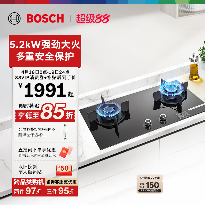 【新品】西门子嵌入式燃气灶具5.0大火力家用双灶玻璃天然气8A3B