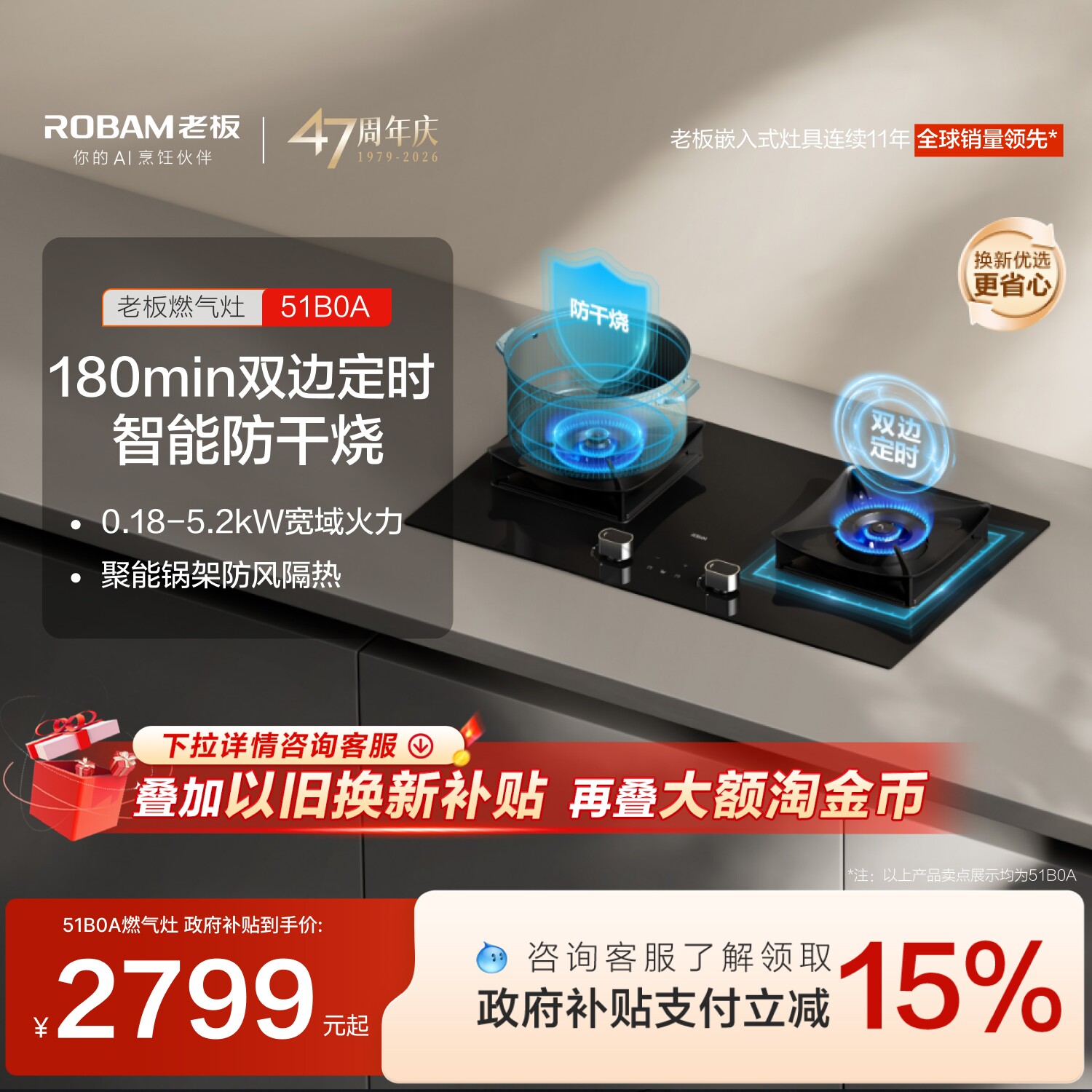 老板安全大火力51B0A定时防干烧燃气灶煤气灶家用双灶台官方旗舰