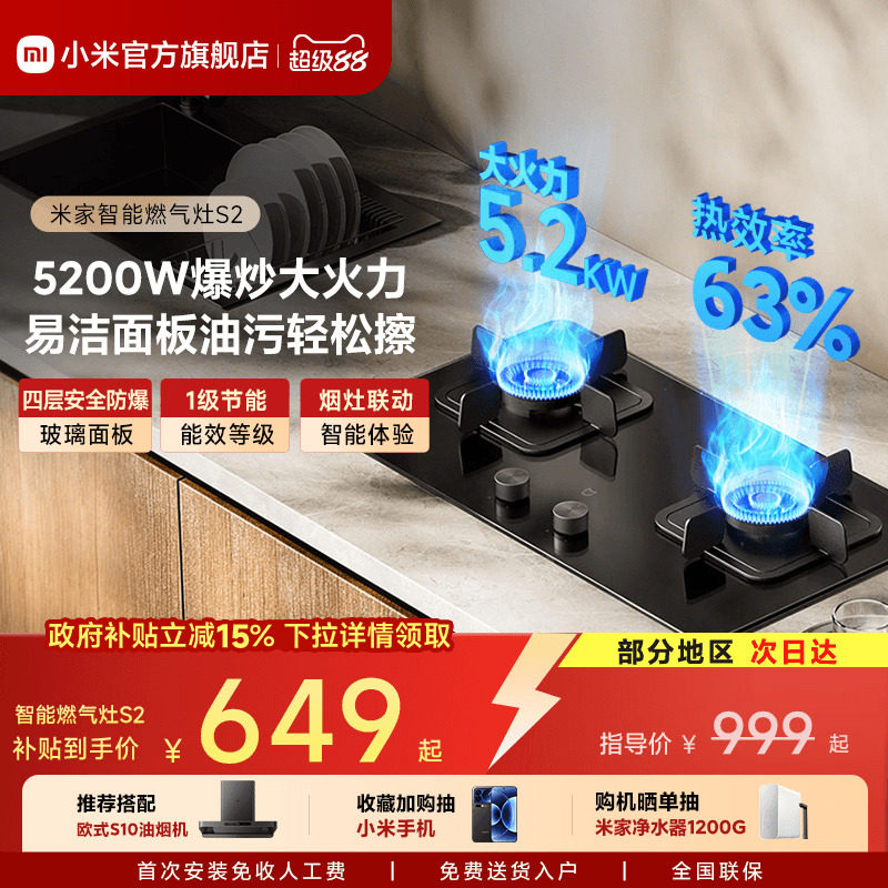 小米官方米家智能燃气灶S2家用灶具节能大火力天然气煤气灶台嵌入
