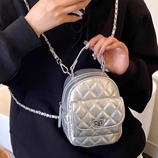 超火小香风迷你双肩包包女2025新款潮银色链条水桶包旅行包登山包