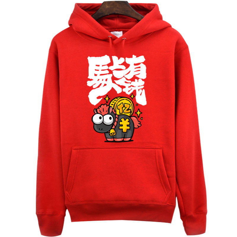 红色套头加绒卫衣2026春秋冬宽松马上有钱本命年衣服加绒加厚外套