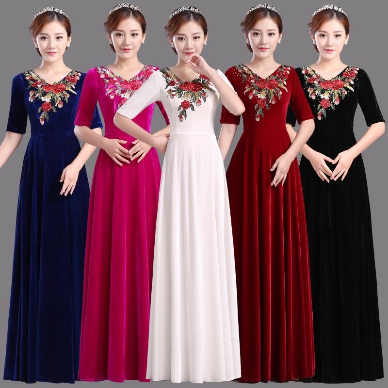 新款金丝绒大合唱礼服演出服女长裙成人中老年合唱团指挥服晚礼服