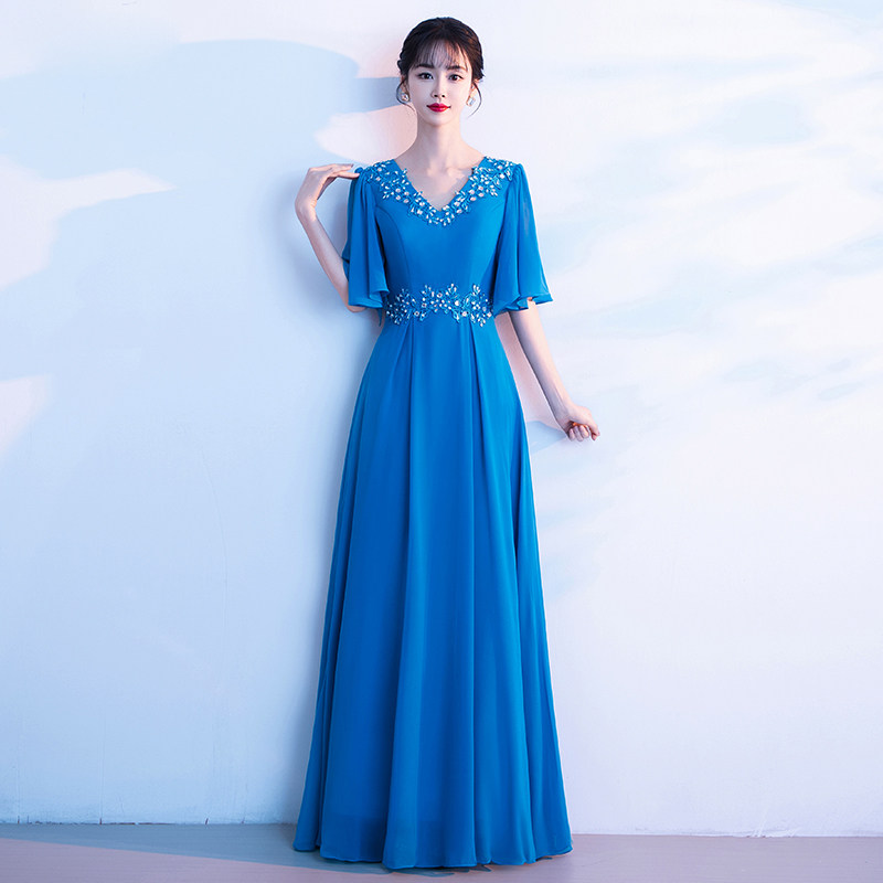 蓝色大合唱演出服女长裙中老年主持人礼服端庄大气高级感高端2322