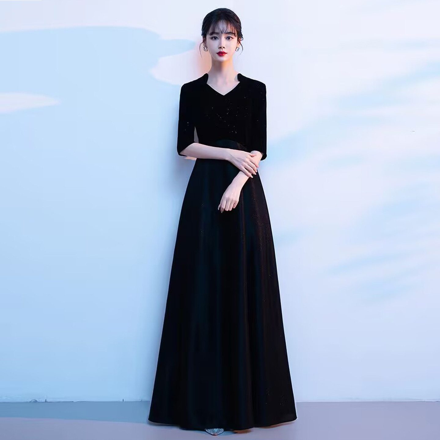 黑色年会晚礼服大合唱演出服女长裙艺考主持钢琴朗诵独唱指挥服装