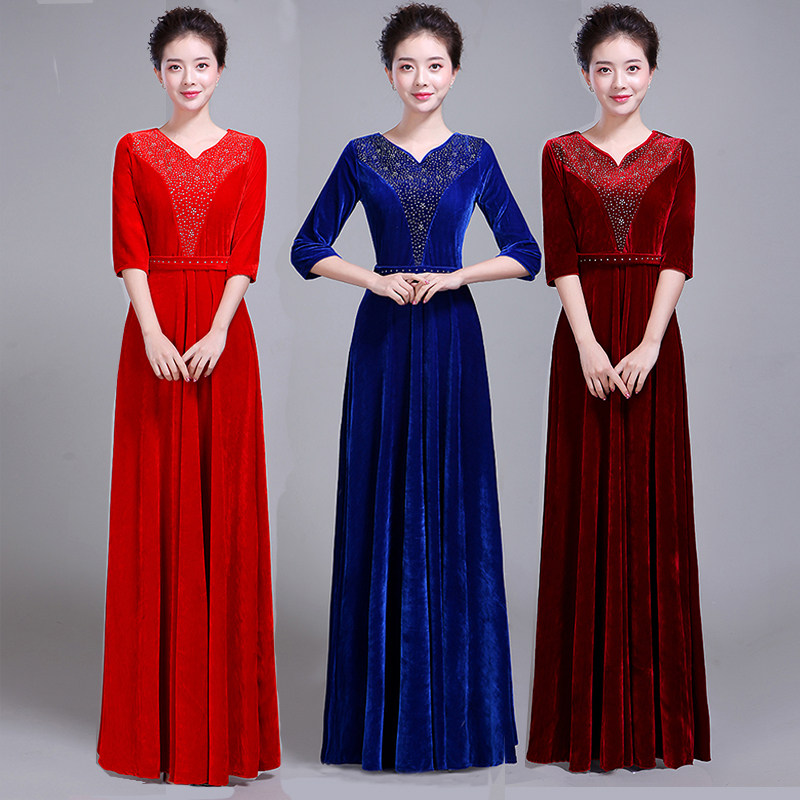 中老年大合唱演出服女长裙乐团指挥礼服秋冬季成人舞台服装金丝绒