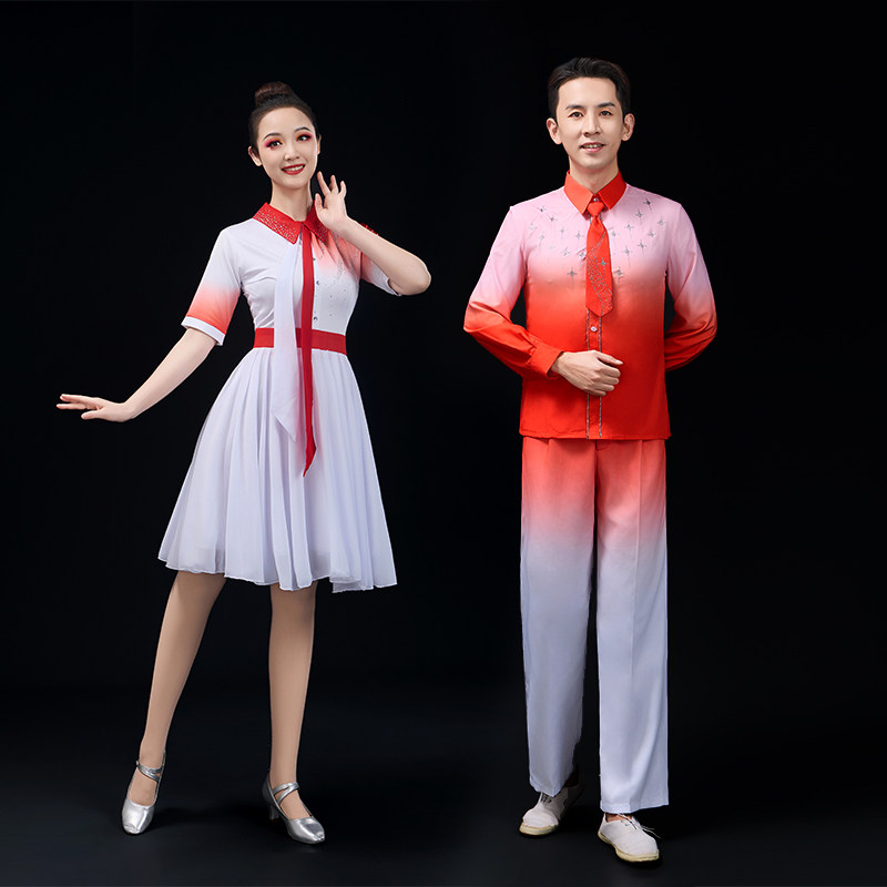 成人大合唱演出服女长裙男女中国风红歌比赛诗歌朗诵合唱团演出服