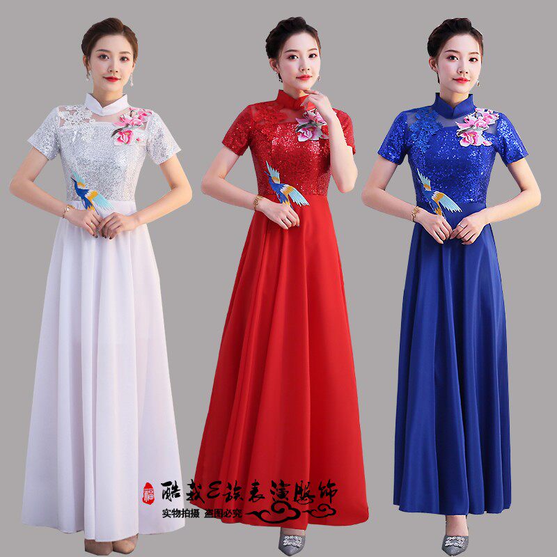 大合唱服演出服女长裙新款红歌比赛独唱表演服主持合唱团中式礼服