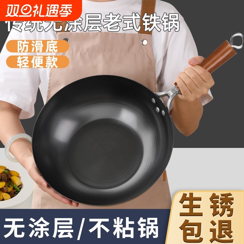正品传统老式平底铁锅炒菜煎锅家用不沾锅无涂层电磁炉煤气灶专用