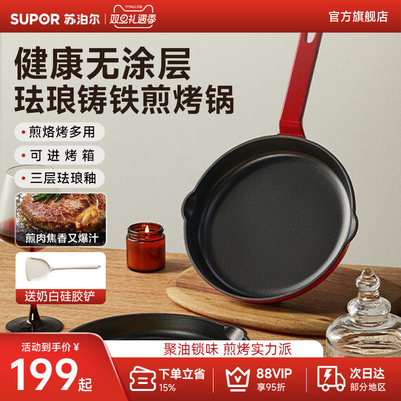 【新品】苏泊尔珐琅铸铁无涂层平底锅家用不粘锅牛排煎锅平底铁锅