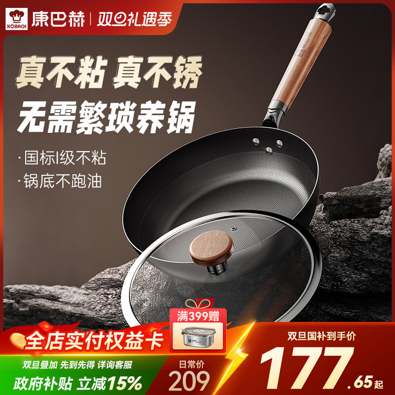 康巴赫炒锅氮化防锈平底铁锅电磁炉煤气灶通用精铁家用炒菜不粘锅