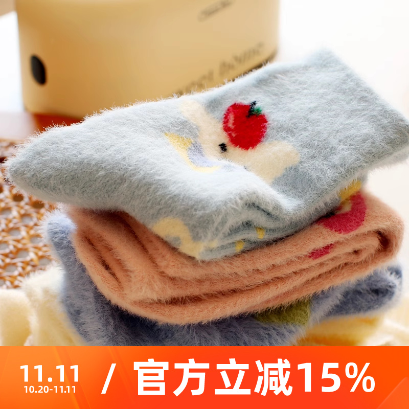 米吉诺拉无骨冬季加厚保暖水貂绒卡通女款袜子柔软月子睡觉中筒袜